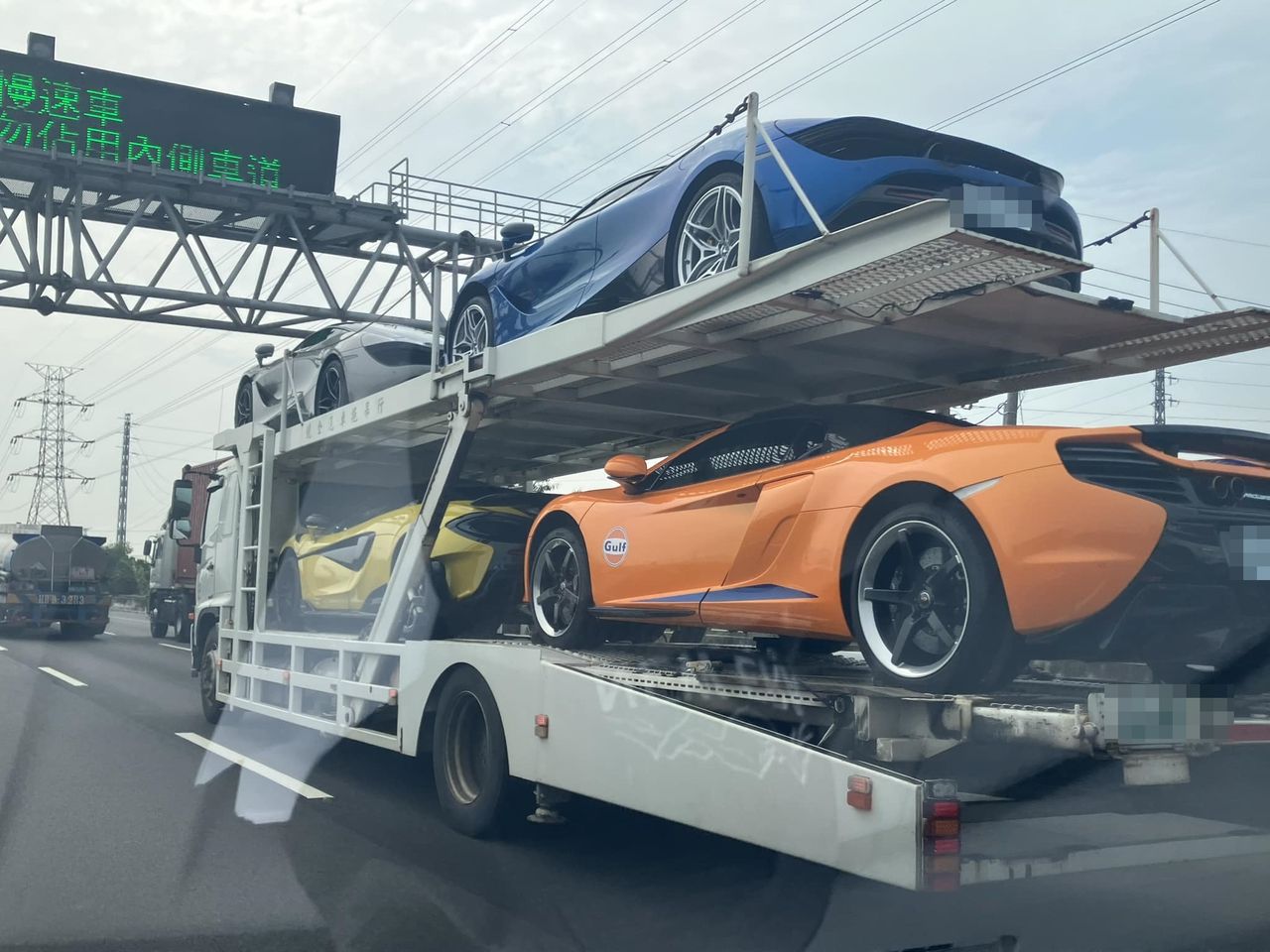 原PO在臉書「路上觀察學院」表示,他日前在國道遇到麥拉倫,「我大腳一踩,一次4台就輕鬆被我甩在後面了」。照片則可以看見,運輸車上載著灰白、藍色、黃色及橘色等共輛4麥拉倫,遠遠看去畫面相當壯觀。