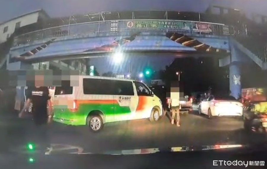 雙方一路僵持開到大成國小前天橋下路段時,白色廂型車突然開始蛇行,最後與黑色廂型車以倒V字形方式直接停在路上,攔住蕭男去路,2名男性駕駛先後下車,一人走到駕駛座車窗外怒罵嗆聲,另一人則走到車頭右前方以手掌重拍引擎蓋示威;蕭男同時也有以手機錄影蒐證,同車女伴嚇得連聲驚呼:「不要!不要!」
