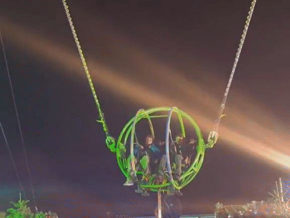 但社群媒體瘋傳的影片可見,這座遊樂設施14日晚間發生事故,畫面中2名男乘客坐在座艙內,設施啟動後座艙從地面被拉起,過沒幾秒向空中彈射,但座艙馬上就向左偏移,原來座艙右邊繩索斷裂,只剩下左邊繩索連接在柱子上,導致座艙被拉向左邊,直直撞上柱子,發出「砰」的巨響,懸掛在空中不斷旋轉搖晃,令目睹過程的遊客嚇得髒話連連。