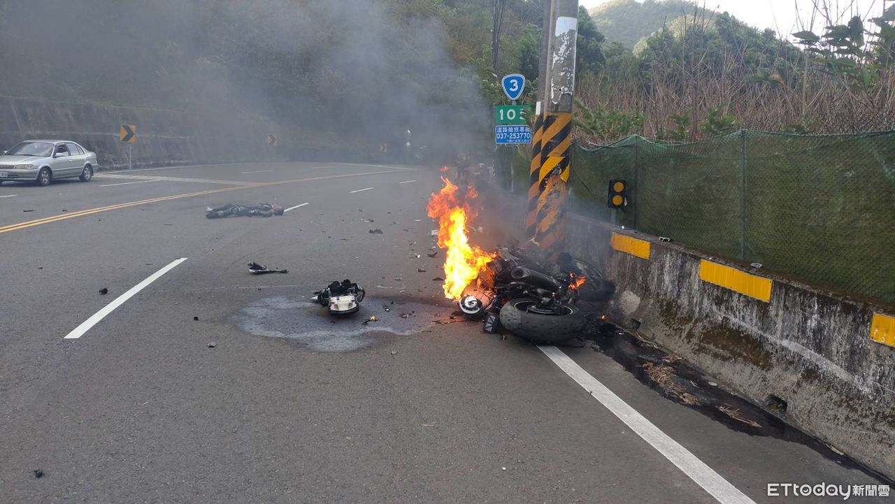台三線105公里處苗栗三灣路段發生車禍!1輛重機不明原因自撞路邊電線桿,車體瞬間起火燃燒,變成廢鐵,而騎士因撞擊力道過大瞬間飛出車外,倒在一旁,疑似已失去意識,警消獲報緊急趕往現場處理,詳細事發原因還有待後續釐清。