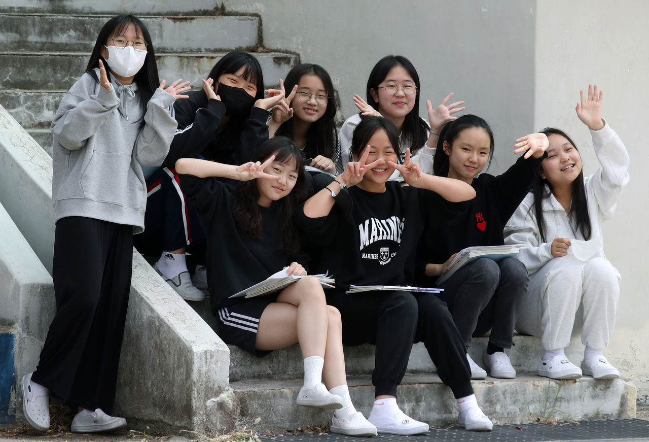 ▲南韓9月26日全數解除戶外的口罩配戴規範,光州一所國小的學生脫下口罩在操場歡呼。(圖/達志影像/newscom)