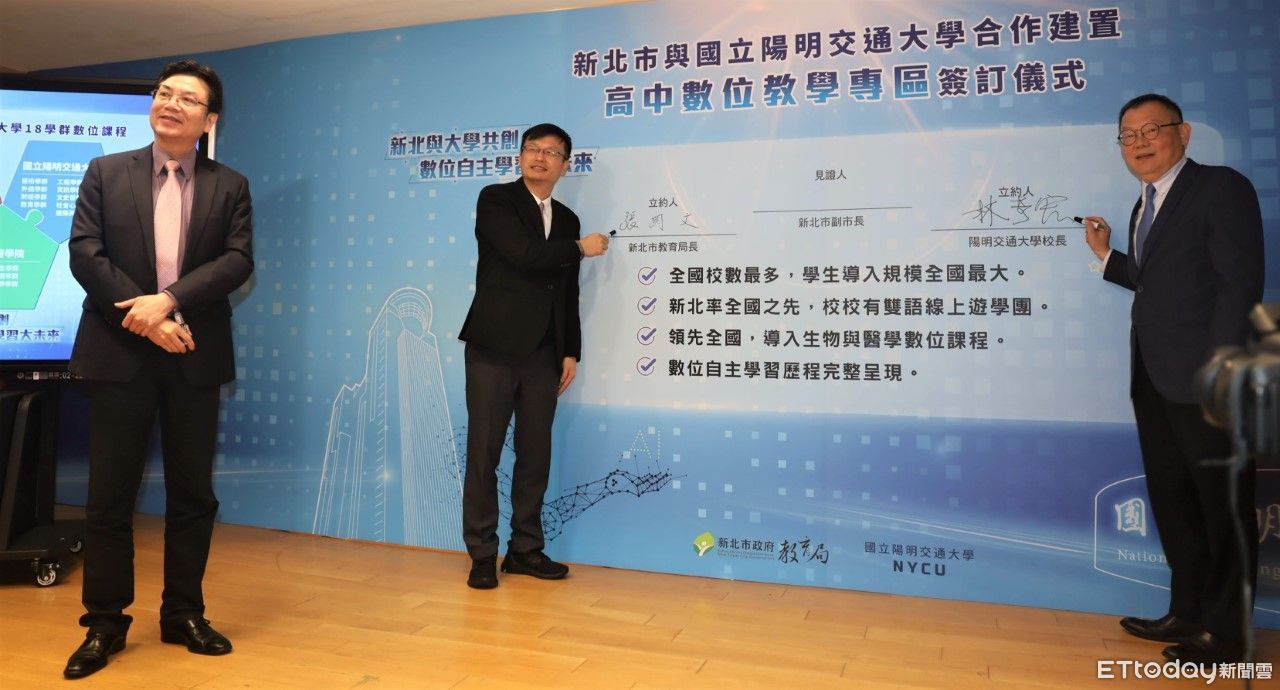 ▲副市長劉和然(中)的見證下,教育局長張明文(左)與國立陽明交通大學校長林奇宏(右)完成簽訂儀式。(圖/新北市教育局提供)