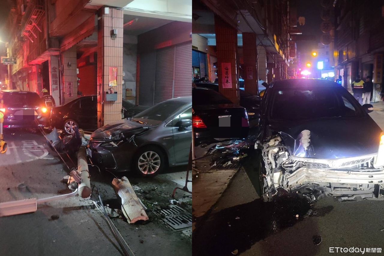 ▲吳男撞斷2根電桿後再撞上2台轎車,其中1台還是賓士轎車。(圖/記者許權毅翻攝)