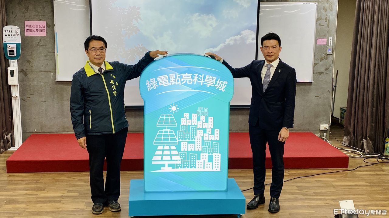 ▲市長黃偉哲(左)與智禾金碳董事長陳坤宏(右)共同啟動綠電點亮科學城。(圖/記者林悅翻攝,下同)