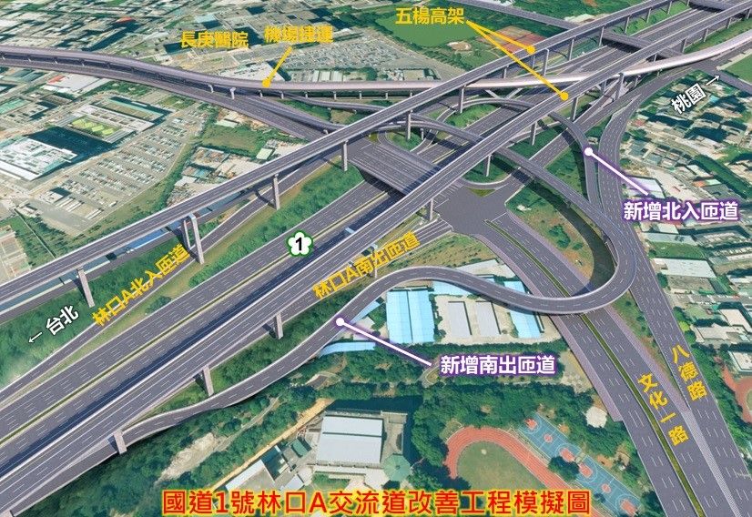 林口交流道囿於台地地形,前後主線為長爬坡路段縱坡大並受地方道路號誌停等影響,造成尖峰時段經常壅塞。為打通交通瓶頸,高公局在無新增用地全部使用公有地之條件下,克服萬難研提增設林口A南出、北入高架匝道及林口A、B南出南入(北出北入)立體化交織改善。