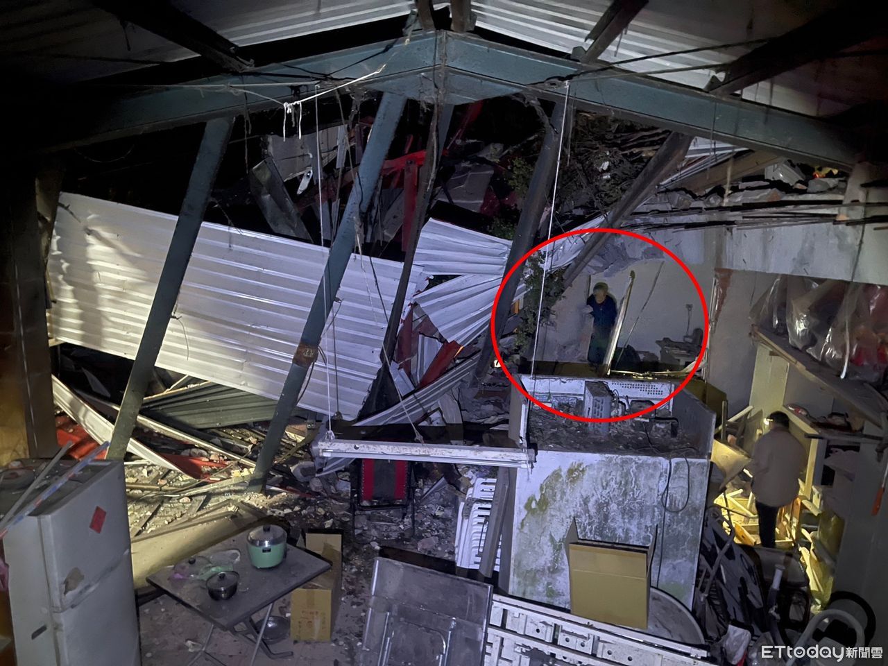 ▲▼巨石壓爛濟公廟,所幸廟公(紅圈處)沒受傷,從瓦礫堆中爬出。(圖/記者陳雕文翻攝)