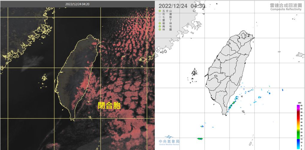 ▲24日4:20真實色雲圖(左圖)顯示,台灣天氣晴朗,東側海面有開放胞(opencells)轉換成的閉合胞(closecells)。4:30雷達回波合成圖顯示,伴隨的降水回波不明顯(右圖)。(圖/三立準氣象· 老大洩天機)