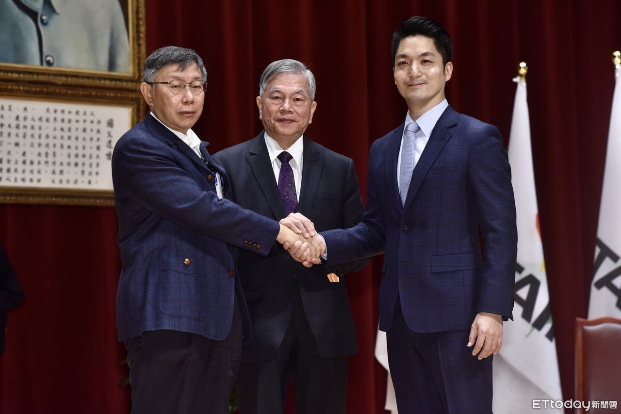 ▲台北市長交接典禮,柯文哲與新任市長蔣萬安進行交接儀式。(圖/記者李毓康攝)