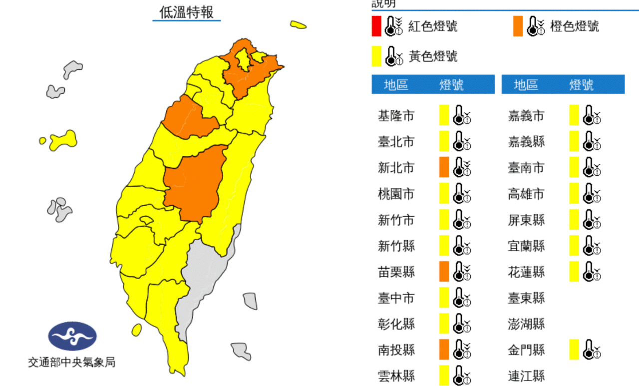 基隆市、臺北市、桃園市、新竹市、新竹縣、臺中市、彰化縣、雲林縣、嘉義市、嘉義縣、臺南市、高雄市、屏東縣、宜蘭縣、花蓮縣、金門縣有10度以下氣溫發生的機率,請注意。
