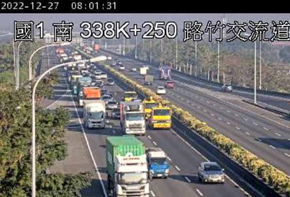 高公局表示,今天7時57分,國道1號南向338K、路竹交流道路段,發生5輛小客車追撞事故,中間以及內側車道,後方車流回堵約3公里。