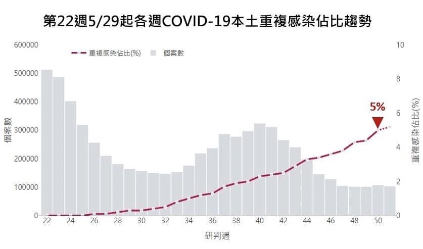 羅一鈞指出,這波疫情預估仍以BA.5為主,高峰預期會在2月初,值得注意的是「重複感染」可能性大增。根據指揮中心統計,近期重複感染占比一直有上升趨勢,過去一周(12/18-12/24)重複感染5976例,約占個案數的5%;總計今年重複感染個案達9萬7037例。