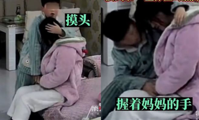 做完這些後,男童看見躺下的媽媽褲腳縮起,小腿外露,怕媽媽受涼,慌忙彎腰為她整理褲管。男童時而摸摸媽媽的額頭,又時而搓搓她冰涼的手,焦急的神情展露無遺。等到爸爸進屋一把拉起媽媽餵其喝水後,男童又即時從後抱着軟弱無力的媽媽,為她整理頭髮,好讓她可以喝水,隨後就坐到媽媽身後充當她的「人肉背墊」。