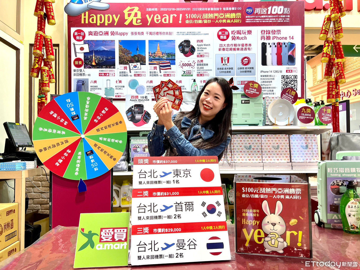 愛買2023年限定「兔年刮刮卡」來了,全台只有7萬張,即日起至2023年1月31日限時開刮,今年大手筆送出3大熱門航點雙人來回機票,頭獎是台北到東京來回機票1組,二、三獎則分別是台北到首爾來回機票2組、台北到曼谷來回機票2組,一共有5位幸運兒有機會只花百元換到機票,還有APPLE Watch Series 8、愛買提貨券5千元等大獎,趕緊衝買。