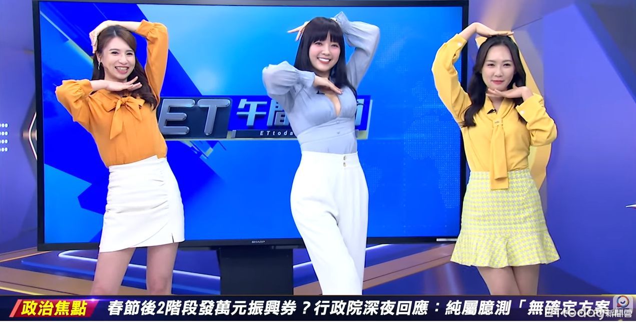 顏議員在訪談最後也當一日主播,為ET午間新聞觀眾播報千萬超跑當靈車的新聞,並和主播們一起JOJO立。