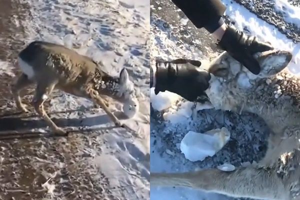 於是,這幾名善心人士立刻停下腳步,協助牠拔掉鹿頭上的冰塊,讓小鹿從被冰封的痛苦中解脫,而被解救的鹿也立刻恢復了生機,活蹦亂跳地離開了。