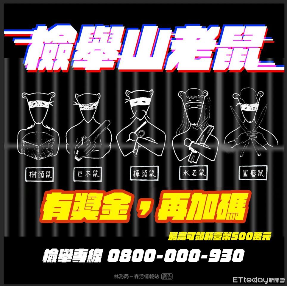 林務局於日前公告修正《森林保護辦法》第30條、第33條及第40條之1規定,將檢舉盜伐獎金最高額由新臺幣300萬元提高至500萬元,希望鼓勵民眾多多舉發,共同打擊山老鼠,守護台灣美好山林。