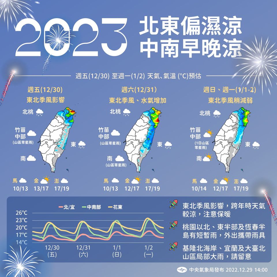 跨年夜也就是周六水氣更增,中南部平地雲量增加,連中南部山區都有零星降雨。元旦、周日之後東北季風減弱,不過桃園以北、東半部、恆春半島依然有雨。
