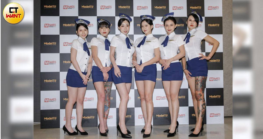 ▲夏晴子、楚夢舒共6位台灣女優,一同穿著爆乳短裙空姐服現身美國行前記者會。(圖/CTWANT提供)
