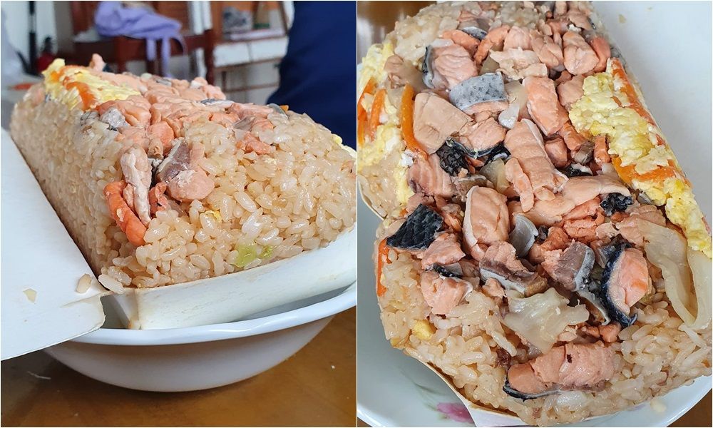 另外,仔細一看,老闆炒飯時還加進雞蛋、紅蘿蔔絲以及高麗菜,最後再舖滿鮭魚肉塊,用料不手軟。原PO就直讚,「鮭魚豪邁給,不是屑屑,都是丁狀肉塊。(炒飯)倒進碗公後,看起來更巨大」,雖然口味是屬於吃粗飽那種,「但光是給料豪邁,也就不用太要求了。」