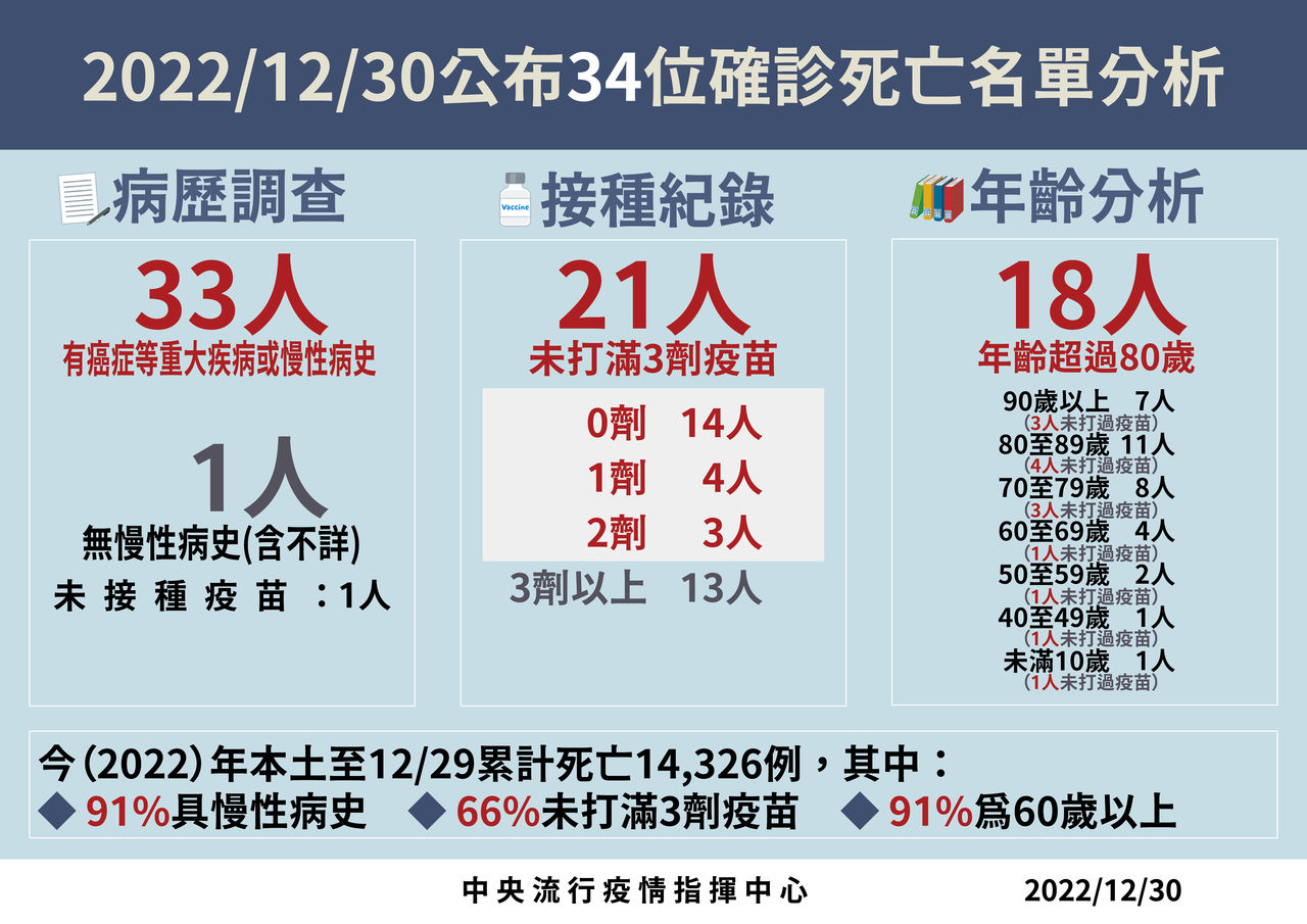 今日COVID-19 新增27,220例本土病例,境外移入193例,另外死亡個案有34例。死亡個案分別為15例男性,19例女性,年齡介於未滿5歲至90多歲以上,皆屬重度感染、33例具慢性病史、21例未接種3劑以上COVID-19疫苗。確診日介於今(2022)年6月23日至12月27日,死亡日期介於7月1日至12月27日。