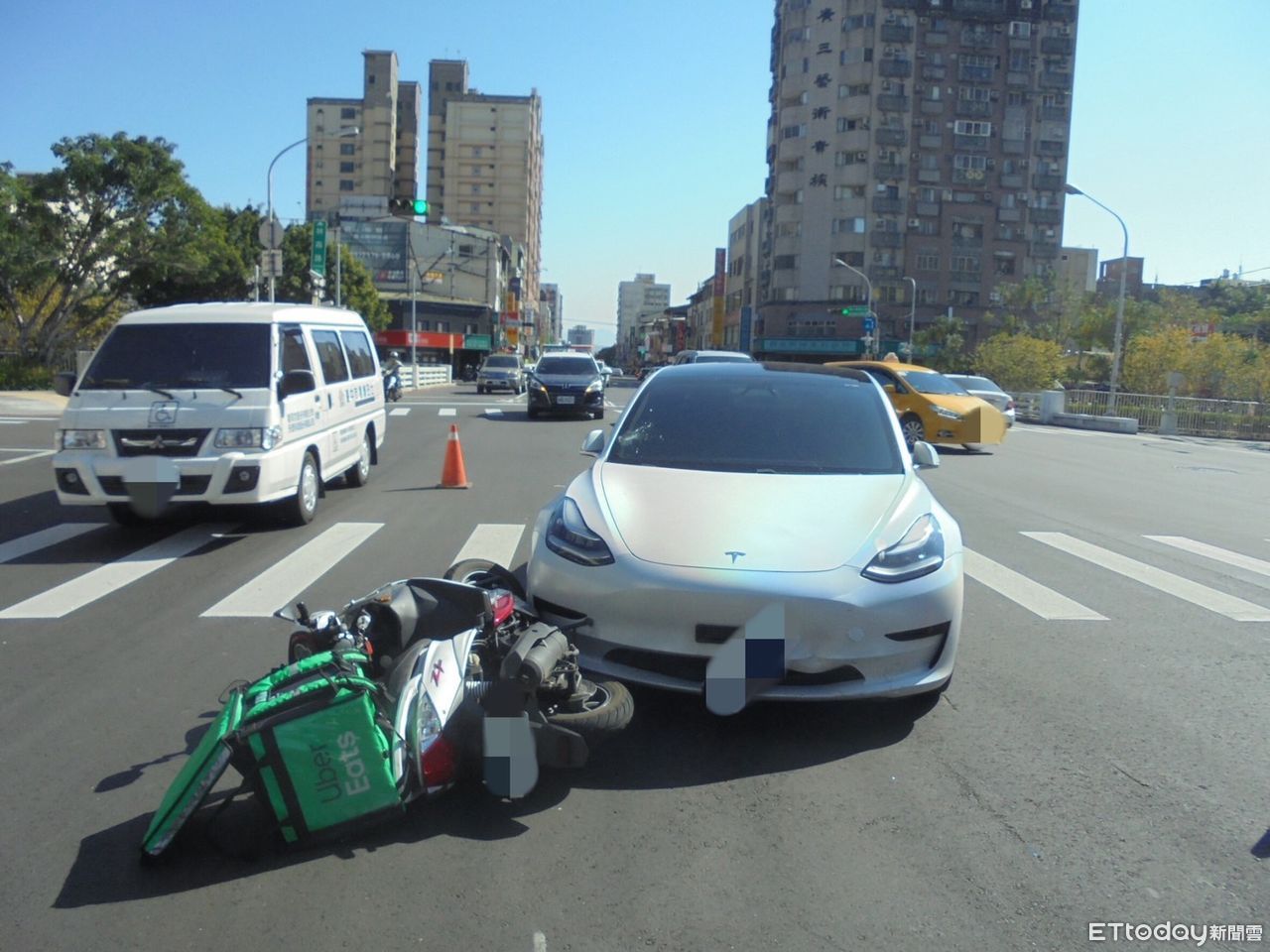 ▲台中西區12月28日發生一起特斯拉闖紅燈撞上外送員車禍。(圖/記者許權毅翻攝)