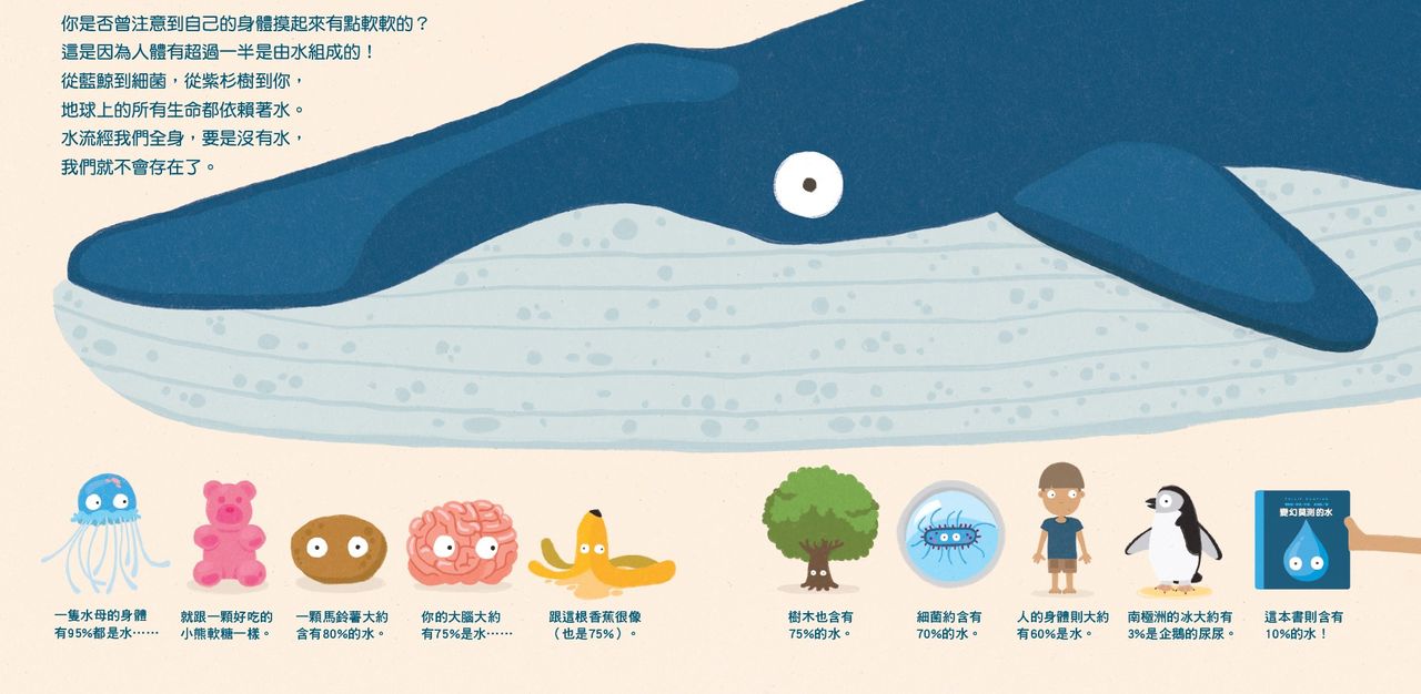 像是水母和小熊軟糖有95%是水;而我們現在喝的水,是數十億年前從外太空來的;身為人類的我們,可能跟幾千萬年前的恐龍喝的是同樣的水;就連南極洲的冰,大約都有3%是企鵝的尿,讓人知道水無處不在,地球萬物都需要水。