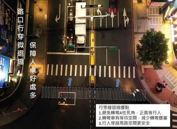 交通局2日表示,後續除將持續挑選符合條件路口擴大實施外,針對近期全台發生多起路口轉彎車撞擊行人之肇事案件,亦已全面檢討全市路口人行穿越道設置合理性並予以適度退縮,以兼顧人車通行效率進而提升交通安全。
