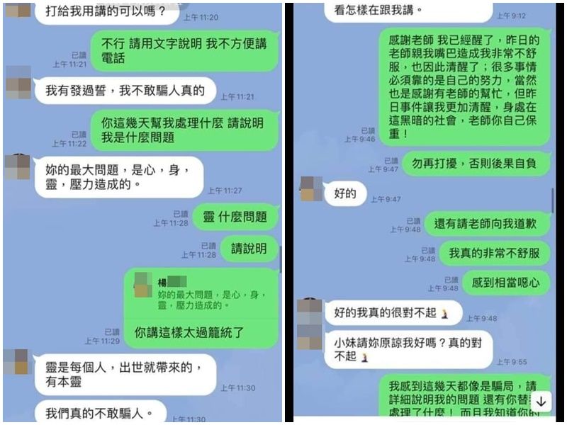 貼文中也附上女信眾與楊男的LINE對話,事發後楊男似乎焦急想用電話解釋,還強調自己發過誓,「我不敢騙人」。不過女信眾拒絕通話,並傳訊表示,「感謝老師,我已經醒了,昨日老師親我嘴巴,造成我非常不舒服」、,「還有,請老師向我道歉」。
