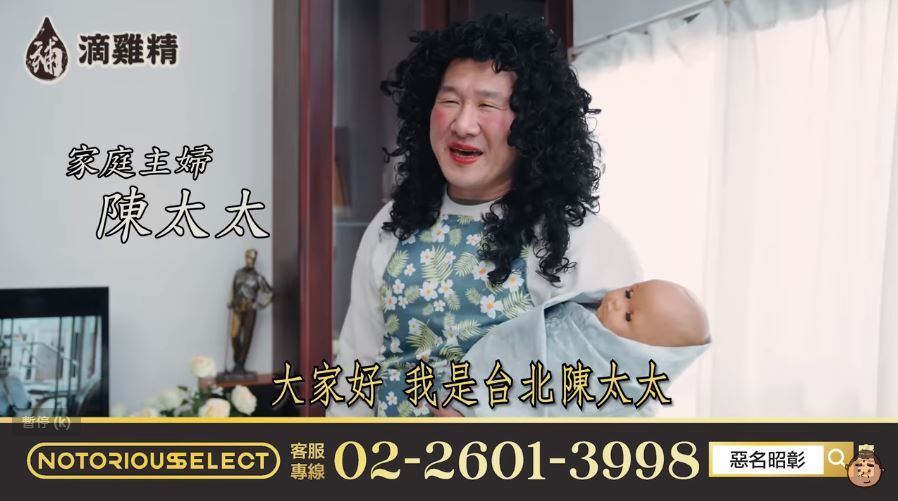 「館長成吉思汗」YouTube頻道日前釋出一支影片,是館長為了旗下產品滴雞精特地出演的廣告,他分別扮成「家庭主婦 陳太太」、「上班族 陳先生」、「銀髮族 林先生」。當中,最吸睛的莫過於家庭主婦的扮相,可以看到館長頭戴超捲的黑色假髮,臉上還畫大紅唇及兩坨圓圓的桃粉色腮紅,身穿碎花圍裙,還抱著假嬰兒。