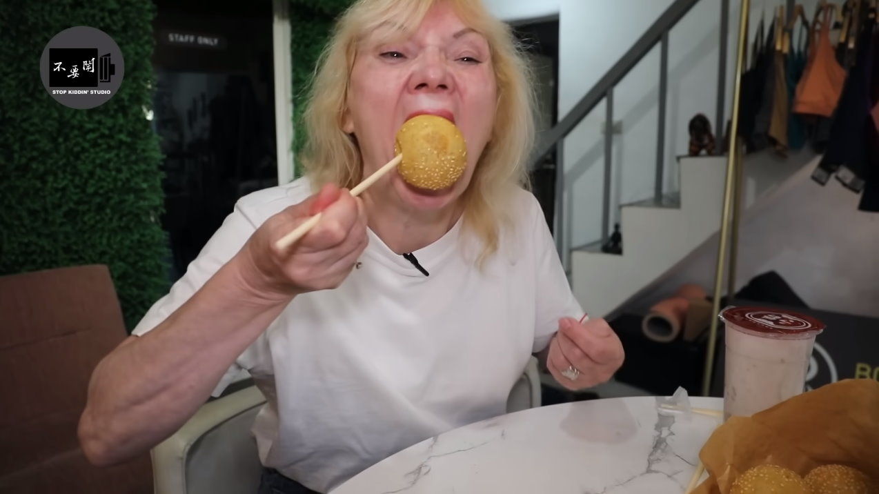 ▼愛民一口吞燒馬蛋,雙手比讚。(圖/翻攝「Stopkiddinstudio」YouTube)