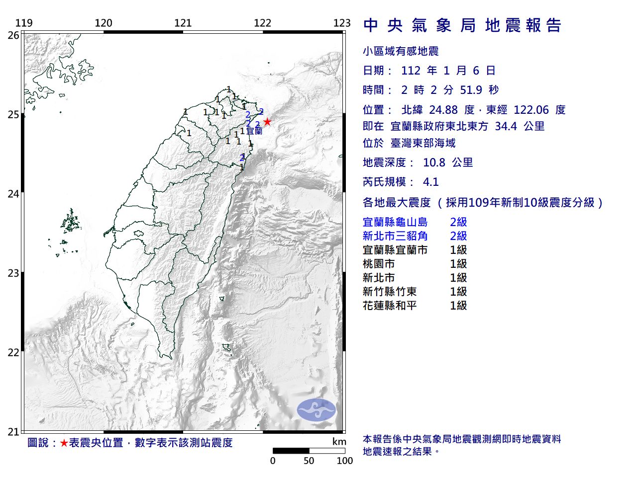 中央氣象局指出,東部海域6日凌晨2點2分發生規模4.1地震,深度10.8公里,震央位在宜蘭縣政府東北東方34.4公里 。