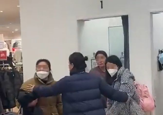 ▲藍色外套女店員攔不住2位媽媽,其中一名黑白格紋家長甚至衝上來搶奪手機。(圖/翻攝自微博)