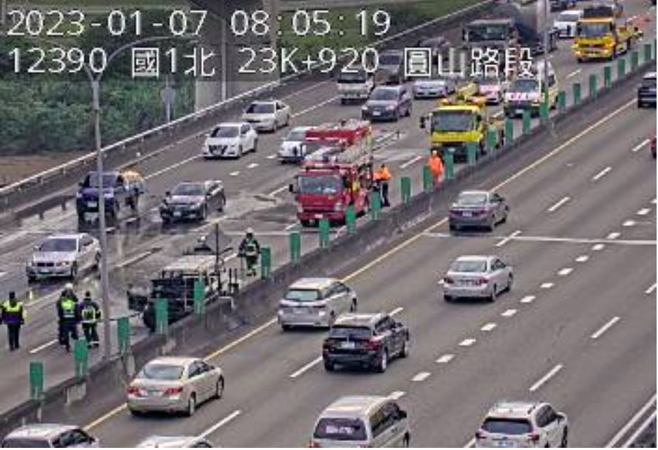 今(7日)國道1號南下23.8公里、圓山交流道附近,一部小貨車在上午7時許突然起火燃燒,濃濃黑煙迅速向天際竄燒,影響到南北雙向的用路人行車安全,並回堵至三重交流道,消防人員目前正在現場灌救。至於小貨車起火原因,有待後續調查了解。