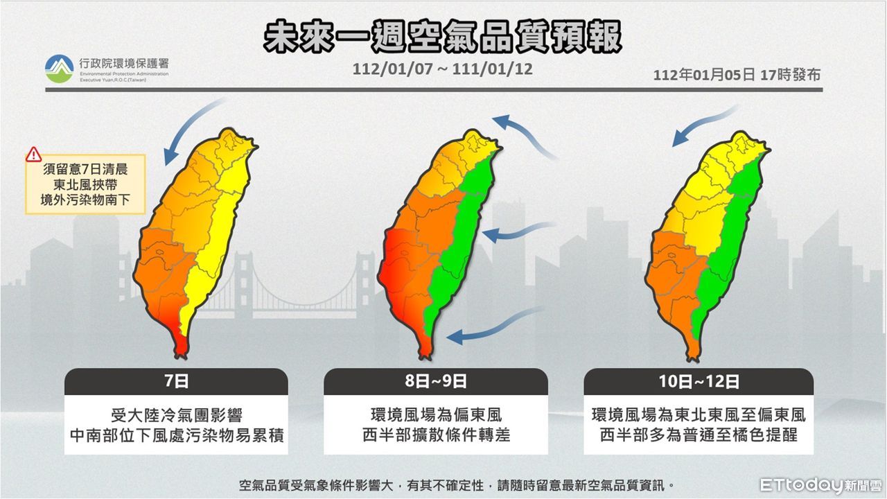 依據環保署監資處空品預報資料顯示,今(7)日起受到大陸冷氣團挾帶境外污染物南下影響,空氣中懸浮微粒濃度將逐漸升高,南部地區於午後至晚間將陸續受影響;明(8)日起冷高壓出海轉為壓迴流天氣,因屏東縣位在全國最下風處,加上本土污染物累積,預估1/7至1/9連續3天將達到空品不良等級。