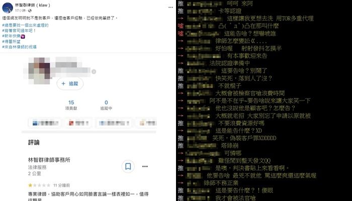 貼文底下有不少網友表示,「每次一堆亂刷餐廳星的都被告到那邊去,怎麼會有人傻到去刷律師事務所」、「真的太蠢,不知道律師的員工優惠就是吉人不用錢嗎」、「歡迎這兩位上法院享受林律師尊榮的服務」。
