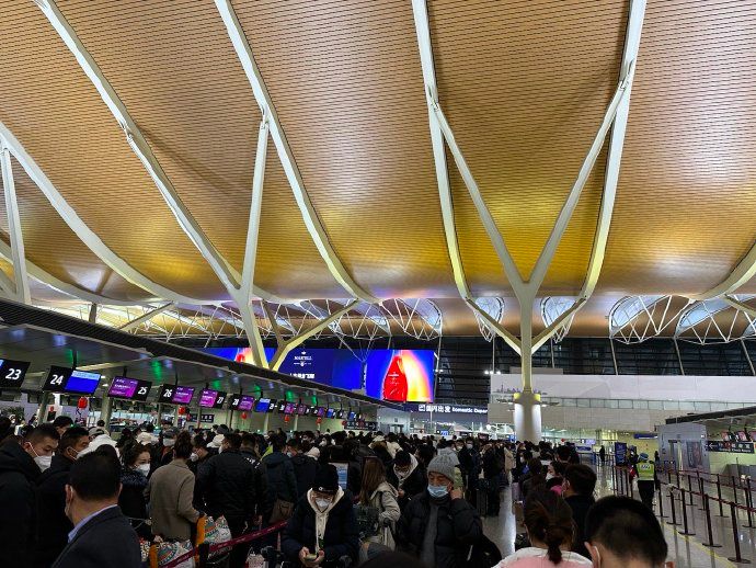 上海浦東機場今日凌晨就有大批民眾在排隊,準備辦理登機。微博博主《軾界》今早PO出北京機場T3航站樓的照片稱,頭等艙金卡十幾個值機通道爆滿,普通乘客那就更不用說了,「已經幾年沒有見過這種壯觀場景了」,過年提前回家的,大包小包出國的,全都聚集機場了。