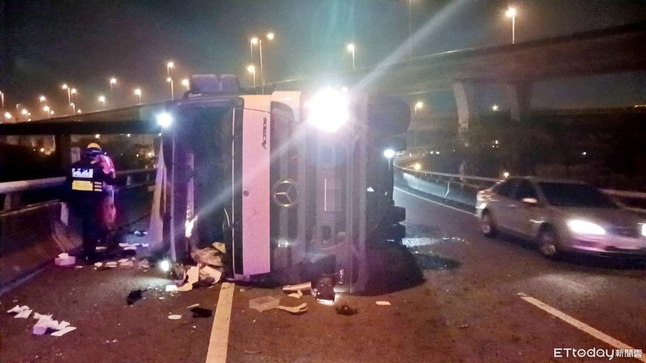 ▲國道一號彰化系統出口8日晚間發生大貨車自撞翻覆事故。(圖/翻攝彰化踢爆網)