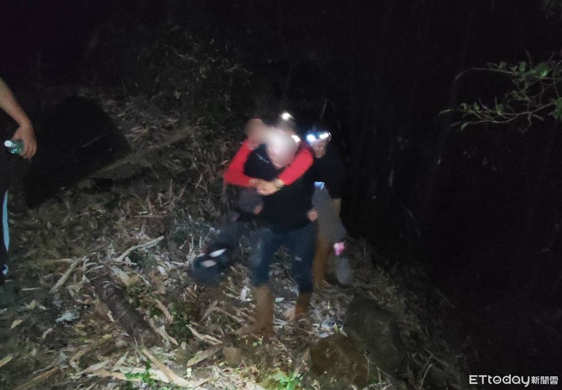 ▲台南市消防局第一救災救護大隊東原分隊警義消組成的救難隊,花6小時時間,冒險將陳女用輪流背負方式護送下山,以救車送醫救治。(圖/記者林悅翻攝,下同)