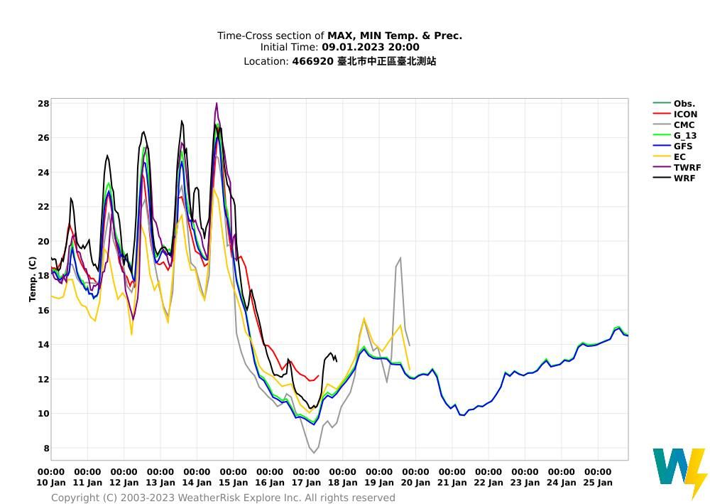▲最新各電腦模式模擬台北氣象站未來溫度,可見周日起氣溫大跳水。(點圖可放大/翻攝彭啟明臉書)