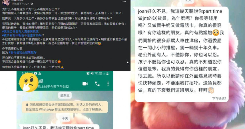 馬來西亞一名女子為了貼補家用,選擇開始兼職外送,沒想到在一次送貨到朋友家之後,卻遭到朋友羞辱「你有這麼窮喔?我很丟臉欸」,甚至揚言「在外面遇見我時快快轉頭走」。而女子也選擇將這段經歷發布在網路上,引起不少網友砲轟女子的友人。