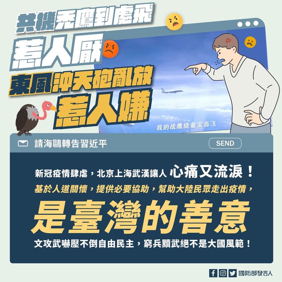 對此,「國防部發言人」臉書粉專今日製作梗圖並發文批評,「共機」禿鷹到處飛惹人厭,「東風」沖天砲亂放惹人嫌,請海鷗轉告習近平,新冠疫情肆虐北京上海武漢,讓人心痛又流淚;基於人道關懷,提供必要協助,幫助大陸民眾走出疫情是台灣的善意,文攻武嚇壓不倒自由民主,窮兵黷武絕不是大國風範。