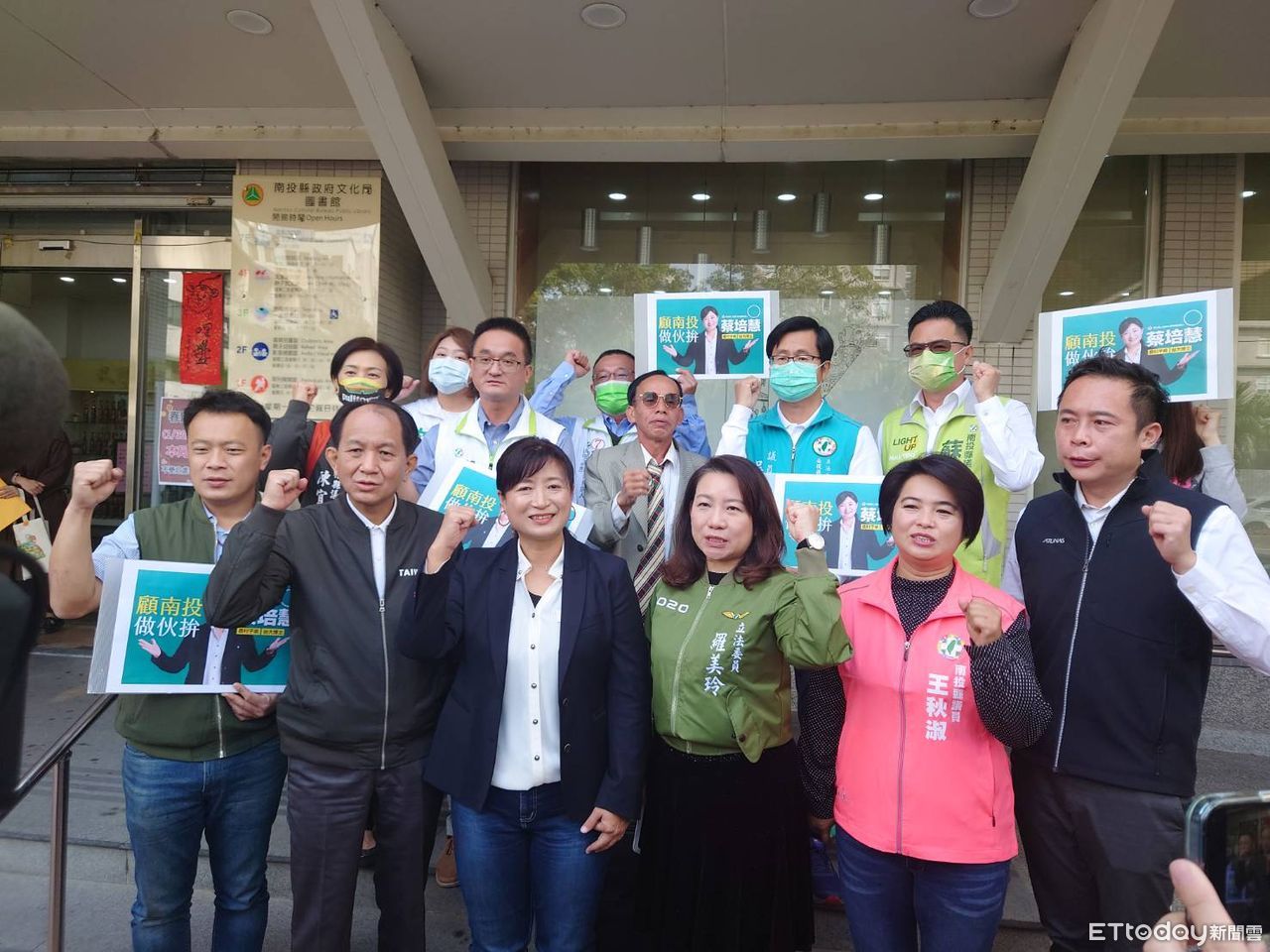 蔡培慧今天上午在立委羅美玲、民進黨黨部主委暨縣議員蔡銘軒、埔里鎮長廖志城、名間鄉長陳翰立以及其他黨籍縣議員陪同下,前往南投縣選委會登記。