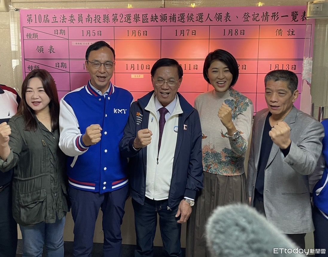 ▲卸任南投縣長的林明溱(中)完成立委補選登記,承諾繼續爭經費建設南投。(圖/林明溱競選團隊提供,下同)