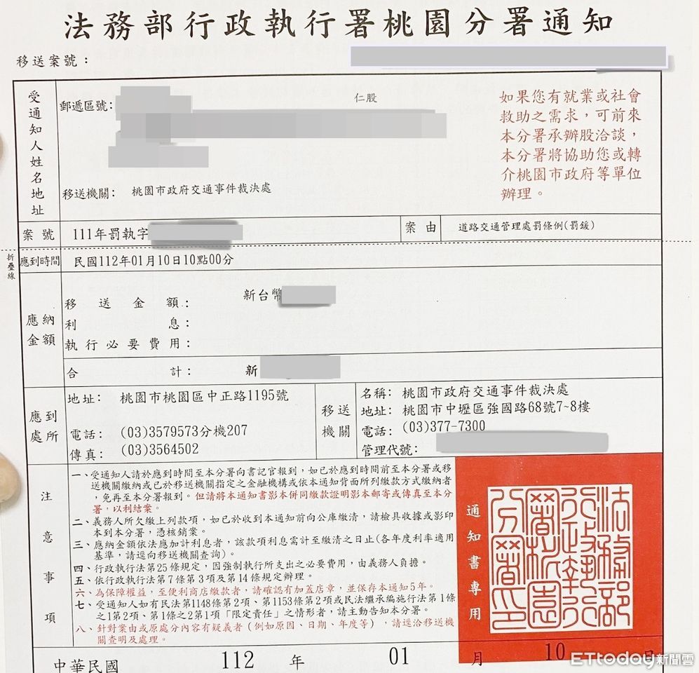 ▲桃園市呂姓男子10年內兩度無照酒駕被裁罰12萬元,卻遲遲未繳清,法務部執行署桃園分署寄出通知後,呂擔心名下財產遭強制執行,立即清償欠繳的11萬餘元。(圖/記者沈繼昌翻攝)