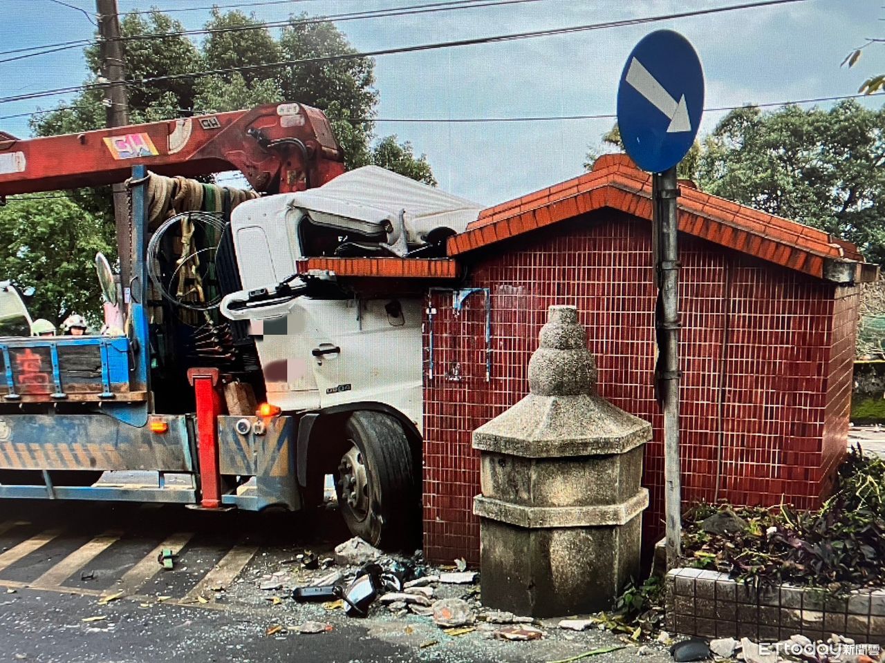 ▲▼大貨車不熟路況,撞路中土地公廟 。(圖/記者陳以昇翻攝,下同)