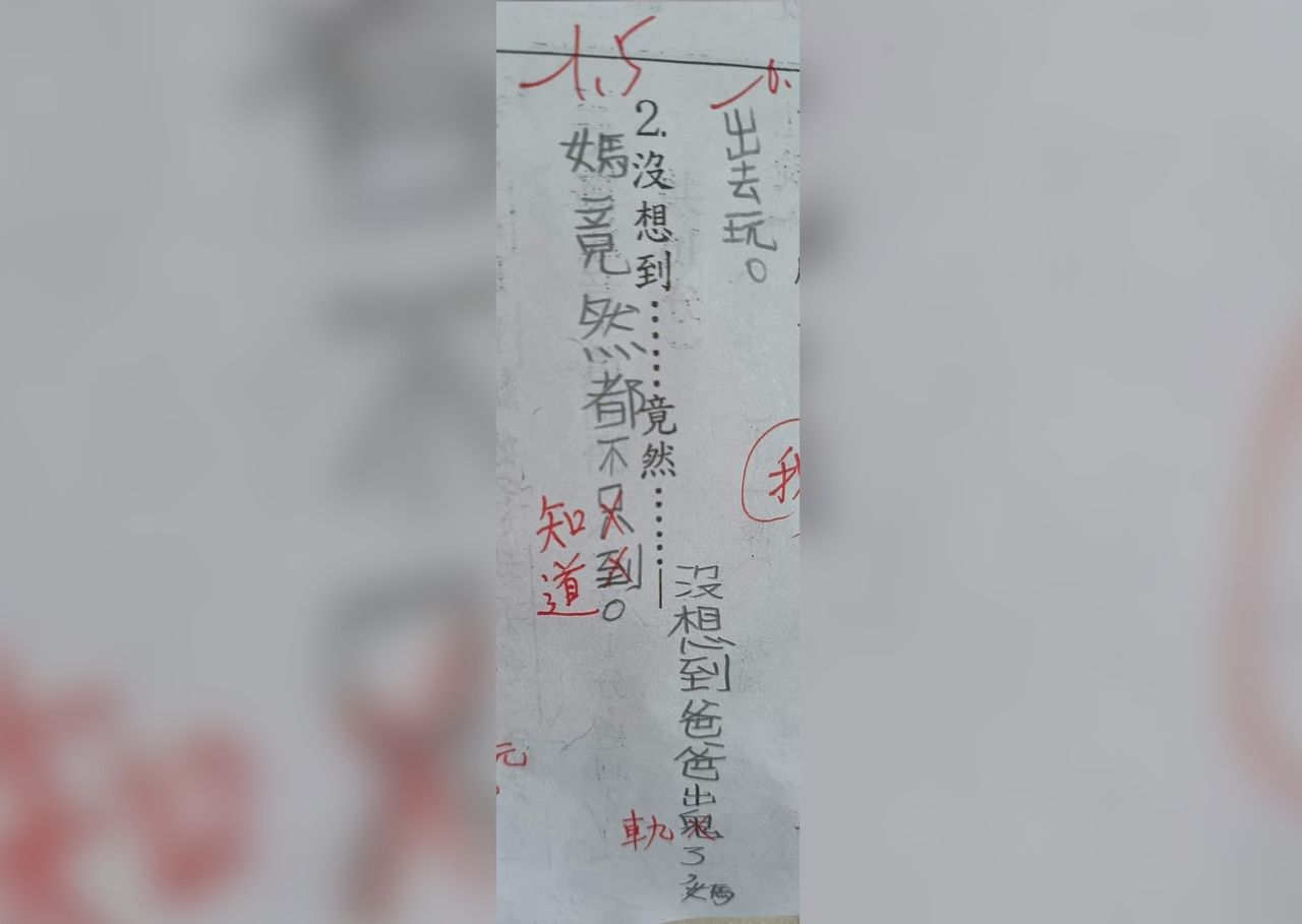 這名網友在臉書社團「爆廢公社」上發文,直呼「什麼造句不造,給我造這個?」從圖片可見,這道題目是「沒想到......竟然......」。女兒看到後,就寫下「沒想到爸爸出鬼(軌)了,媽媽竟然都不只到(知道)。」孩子雖然將「出軌」、「知道」寫錯了,但要表達什麼還是很清楚。