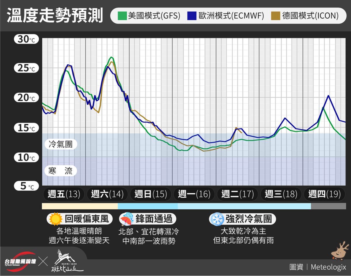 「台灣颱風論壇|天氣特急」分析,周六晚上至周日鋒面系統率先通過台灣,中部以北、東部將出現一波雨勢,溫度也會開始往下掉,北部降溫幅度較大,周日就會有濕冷的感覺;下周一至周三(16至18日)冷氣團主力正式南下,目前觀測強度落在強烈冷氣團至寒流之間,雖然北部、東部偏陰冷,但這波大致上算是以乾冷為主。