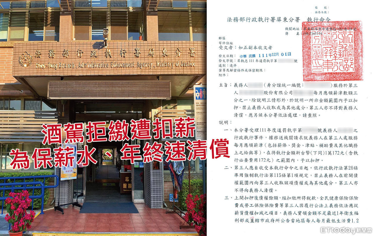 屏東縣新園鄉1中年男子,去年4月酒後騎車,在家門前的大馬路上被警察攔檢,酒測值超過0.15,監理站對他開罰1萬5000元並吊扣駕照12個月,他在監理站分期繳了部分款項後就不再理會這張酒駕罰單,去年底移送法務部行政執行署屏東分署執行。分署受理著手調查他所得及財產狀況,發現他在某上市公司屏東廠上班,遂火速核發執行命令,扣押他每個月薪水的3分之1,男子這才趕緊繳清罰單,分署也迅速通知公司解除扣押。