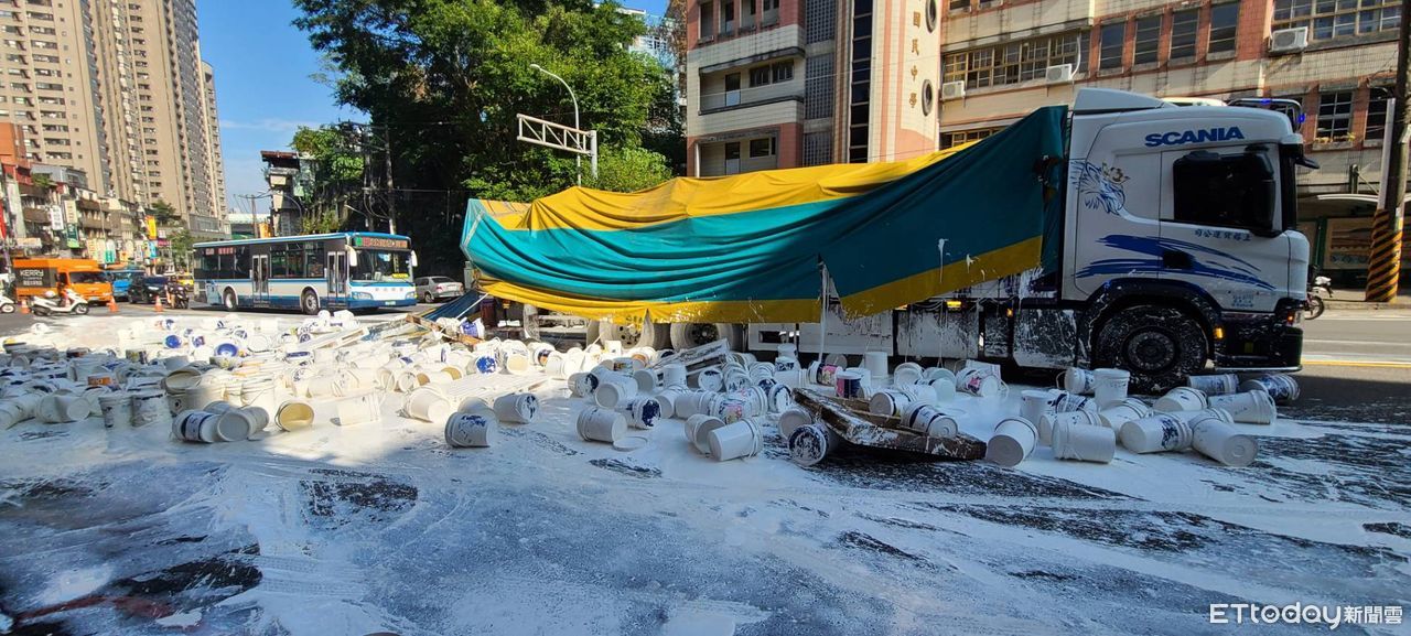 桃園一輛大貨車載著約10噸重的油漆出發,13日上午9點多行經北宜路前往宜蘭途中時,疑因固定繩索鬆脫,導致50個油漆桶脫落且油漆潑灑一地,影響單向2個車道通行,警方獲報後趕緊到場執行交通管制;警方跟環保局於現場評估,將對違規人員進行告發,目前已聯繫景美公務段到場處理掉落之油漆。