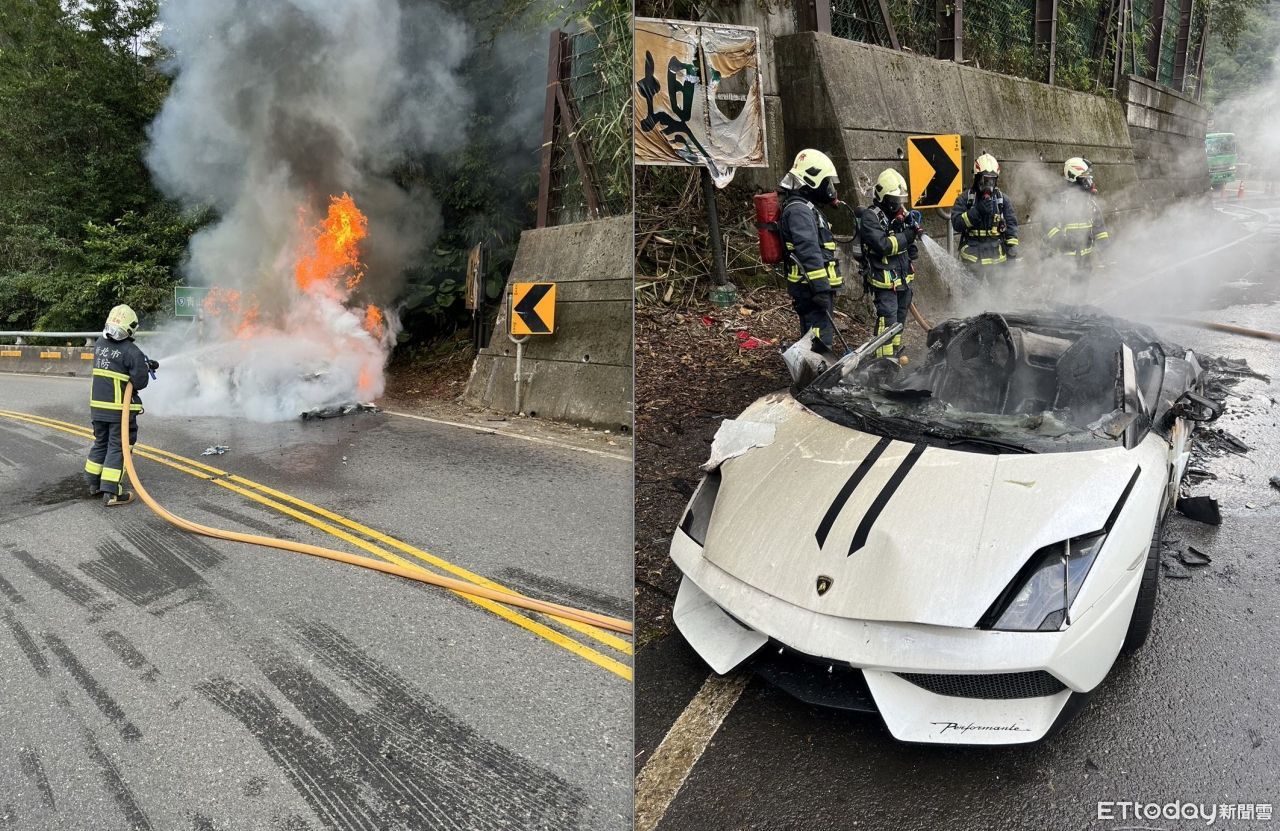 北宜公路一輛藍寶堅尼(小牛)超跑13日下午3點多,行經46.9K時突然燒起來,駕駛及時脫困並報案,消防人員到場趕緊將火勢灌滅,但價值超過千萬的超跑已經變成一團廢鐵,詳細案發原因仍有待調查。
